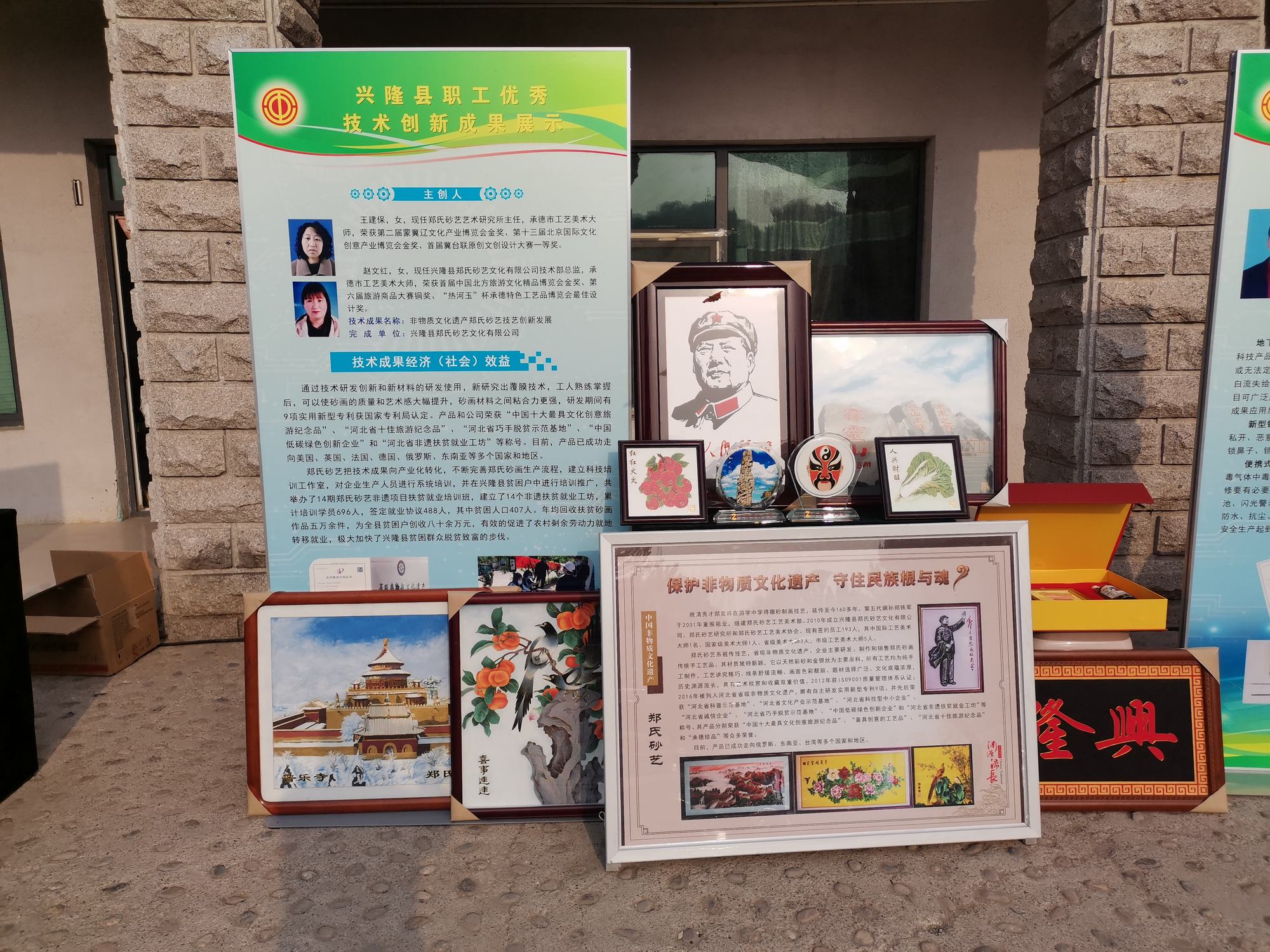 鄭氏砂藝通過推進(jìn)技術(shù)成果的產(chǎn)業(yè)化轉(zhuǎn)化,完善鄭氏砂畫生產(chǎn)流程,建立科技培訓(xùn)工作室和創(chuàng)新工作室,對(duì)企業(yè)生產(chǎn)人員進(jìn)行系統(tǒng)培訓(xùn),并對(duì)我縣相關(guān)培訓(xùn)貧困人員進(jìn)行推廣。其中2019年至2020年兩年間,鄭氏砂藝在本縣蘑菇峪鎮(zhèn)和大杖子鎮(zhèn)14個(gè)貧困村分別舉辦了14期鄭氏砂藝非遺項(xiàng)目扶貧就業(yè)培訓(xùn)班,并建立了14個(gè)非遺扶貧就業(yè)工坊,培訓(xùn)投入近百余萬元,累計(jì)培訓(xùn)學(xué)員696人,簽訂就業(yè)協(xié)議488人,其中貧困人口407人。企業(yè)年均回收扶貧砂畫作品五萬余件,為貧困戶創(chuàng)收八十余萬元,有效地促進(jìn)了農(nóng)村剩余勞動(dòng)力就地轉(zhuǎn)移就業(yè),極大加快了我縣貧困群眾脫貧致富的步伐。