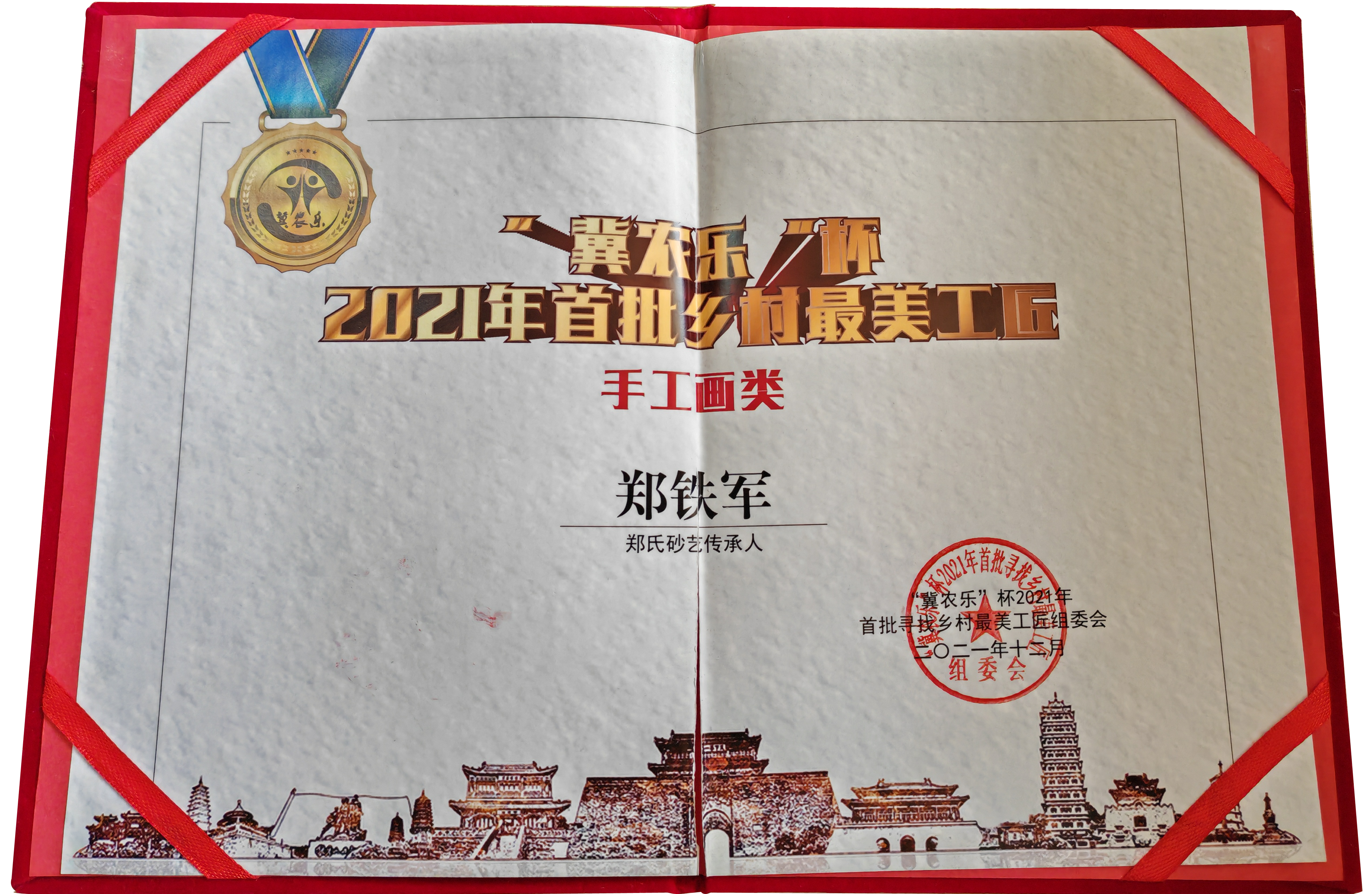 2021年,興隆縣鄭氏砂藝文化有限公司鄭鐵軍在“冀農(nóng)樂(lè)”2021年首批鄉(xiāng)村最美工匠——手工畫(huà)類(lèi) 獲獎(jiǎng),并由“冀農(nóng)樂(lè)”杯2021年首批尋找鄉(xiāng)村最美工匠組委會(huì)頒發(fā)獎(jiǎng)狀。