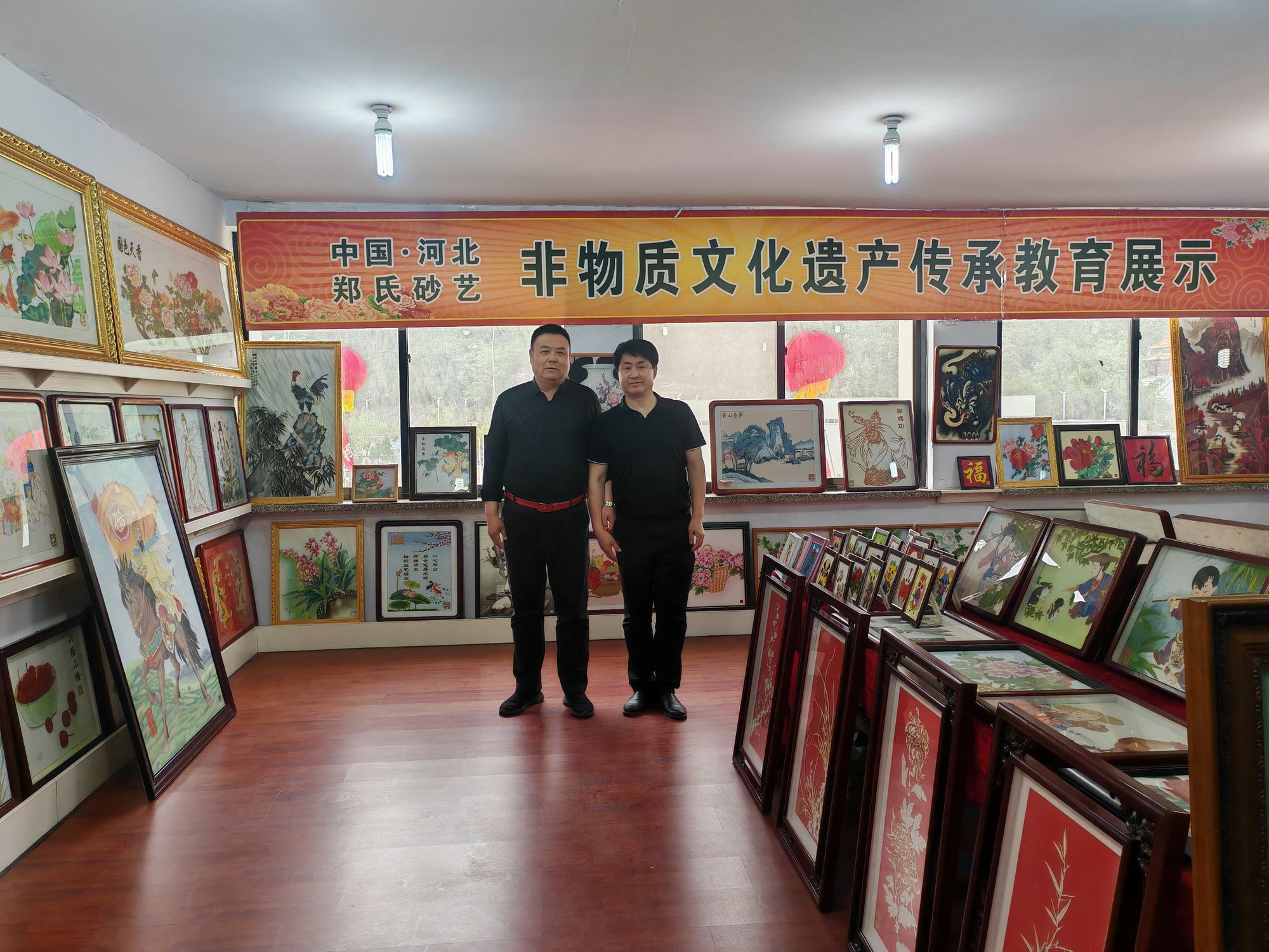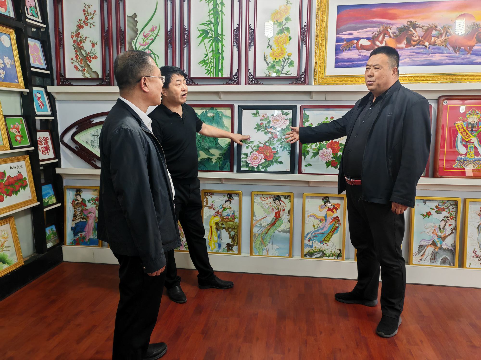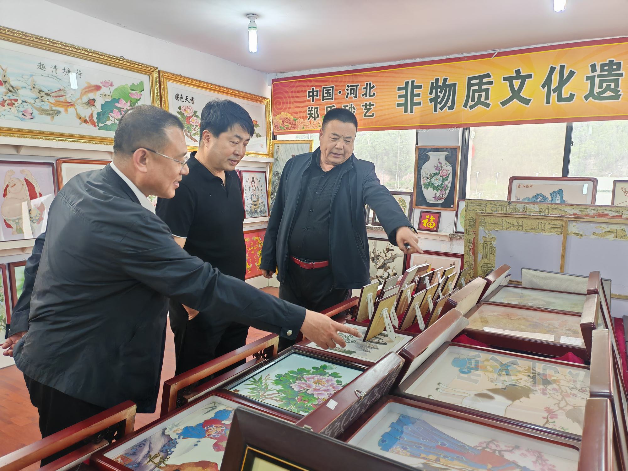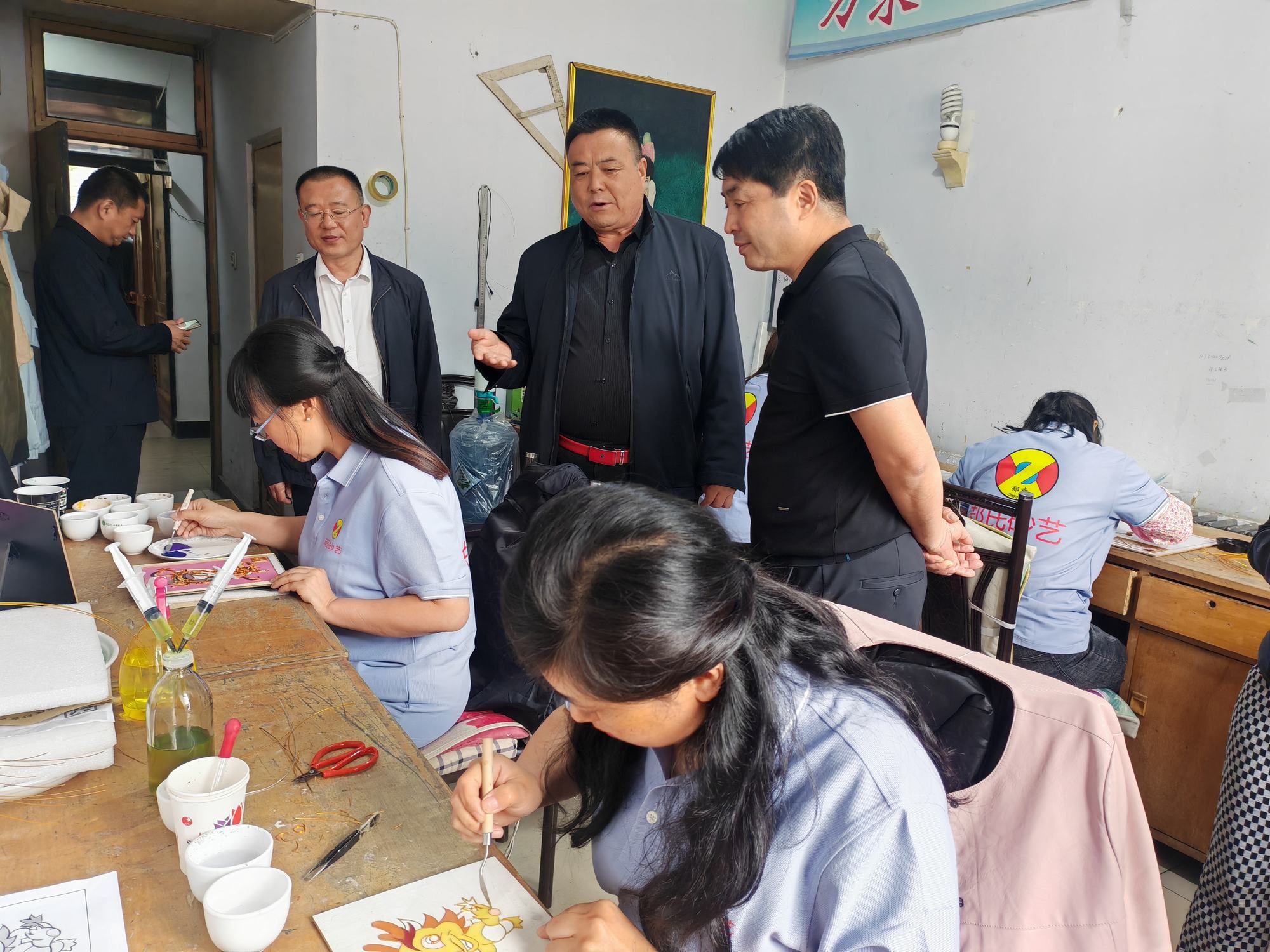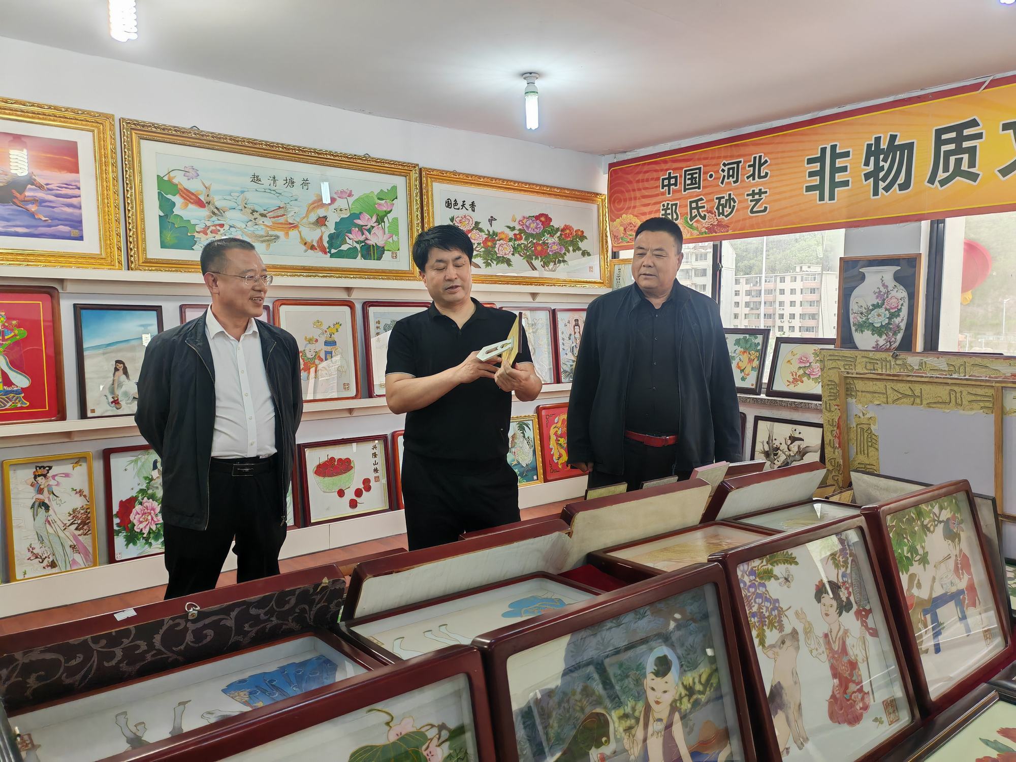 程志忠書記等一行在鄭氏砂藝董事長(zhǎng)鄭鐵軍的陪同下,參觀了鄭氏砂藝非遺文化展館,了解了鄭氏砂藝非遺文化的傳承和發(fā)展。隨后,實(shí)地觀察了鄭氏砂藝(畫)的制作過程,并與砂藝技師們進(jìn)行了交流,了解了砂畫制作原料和技藝手法。