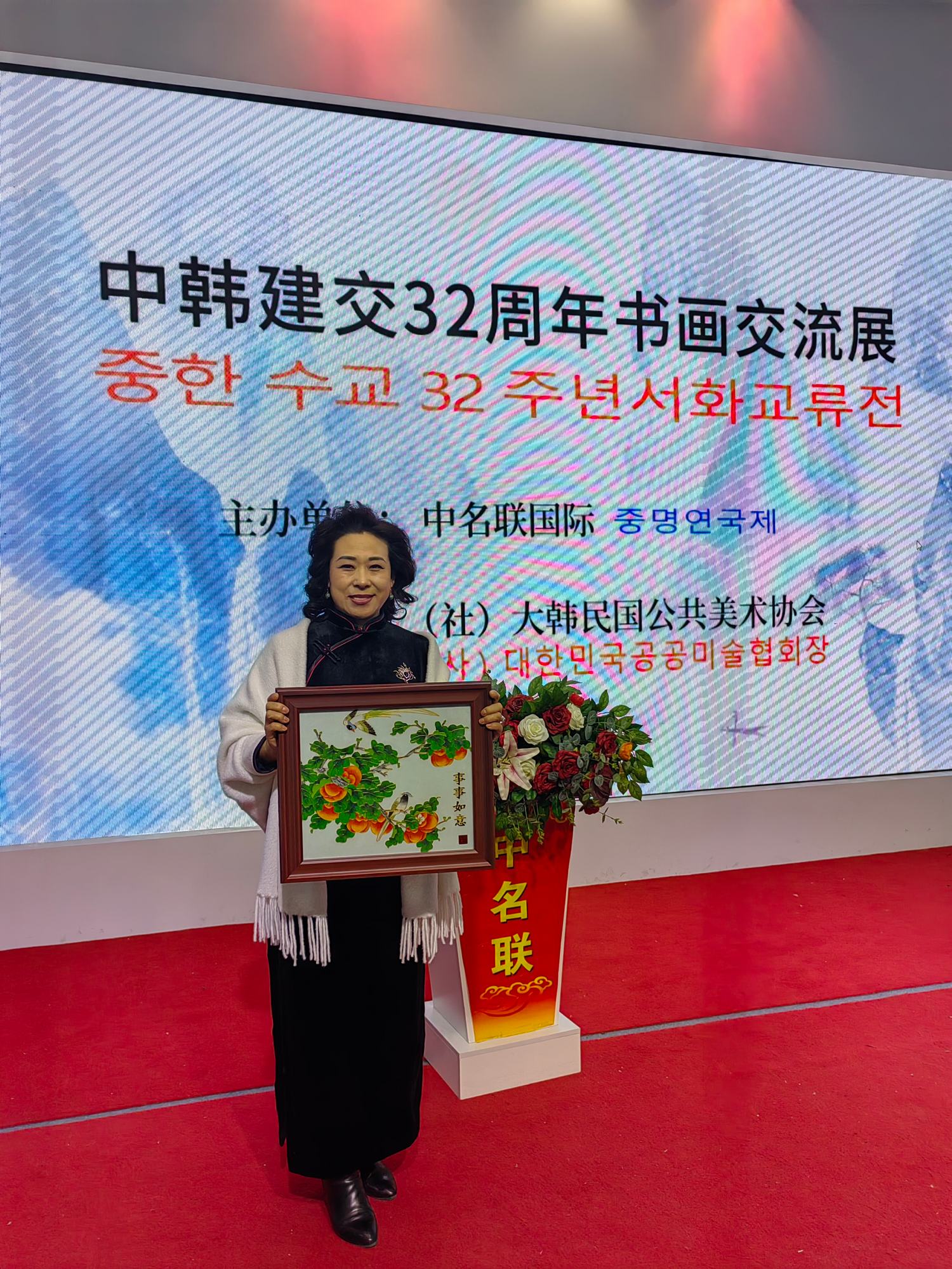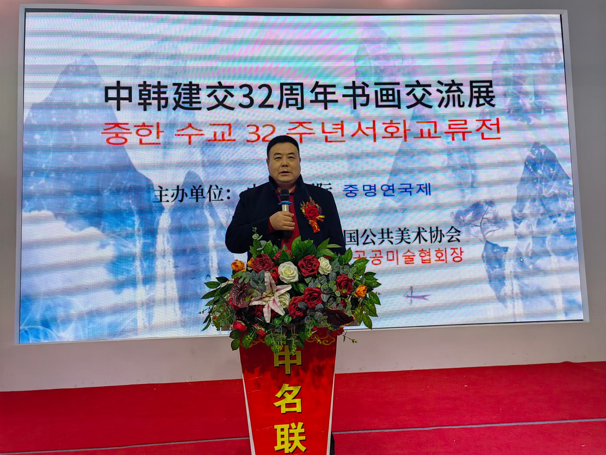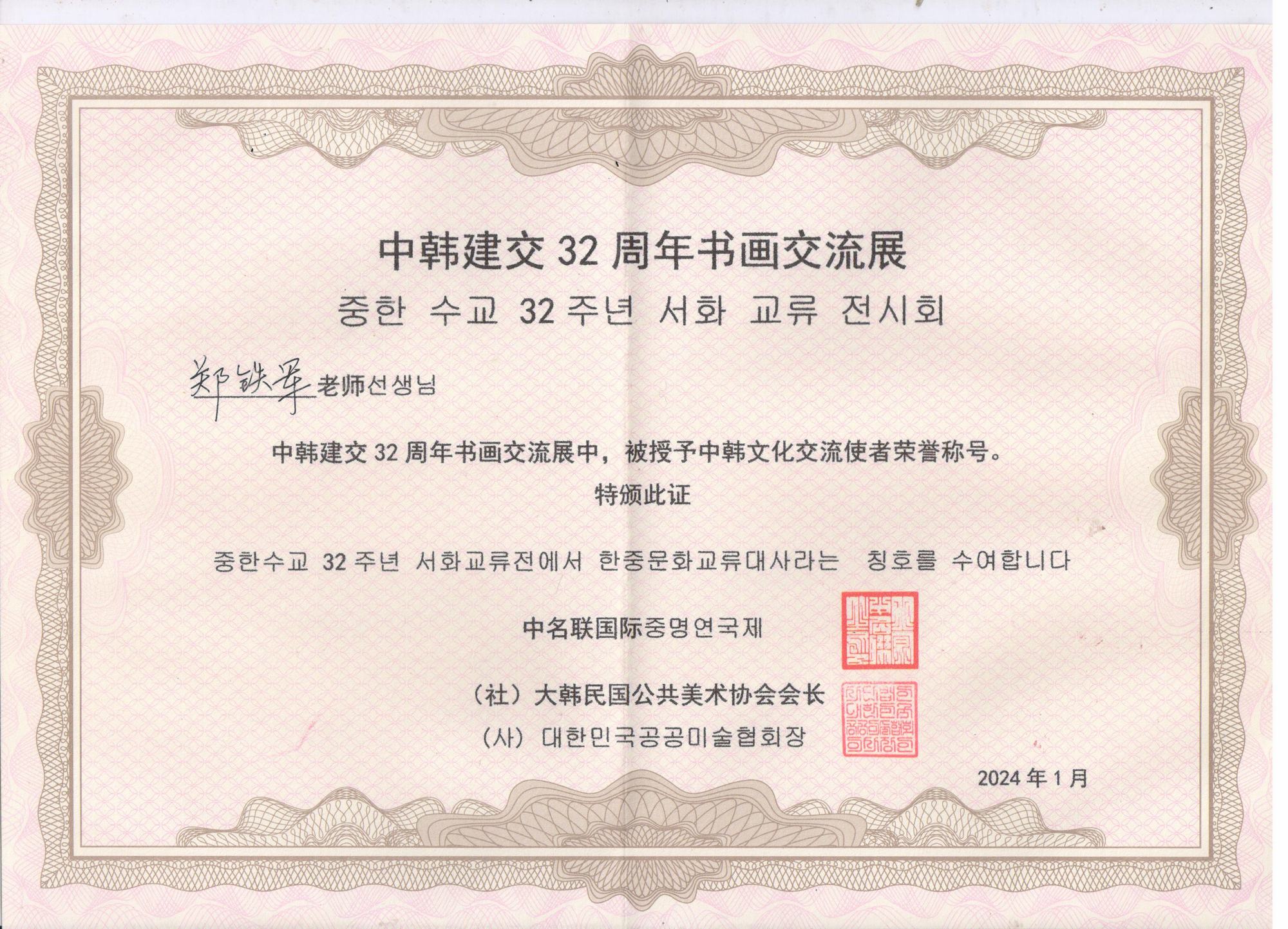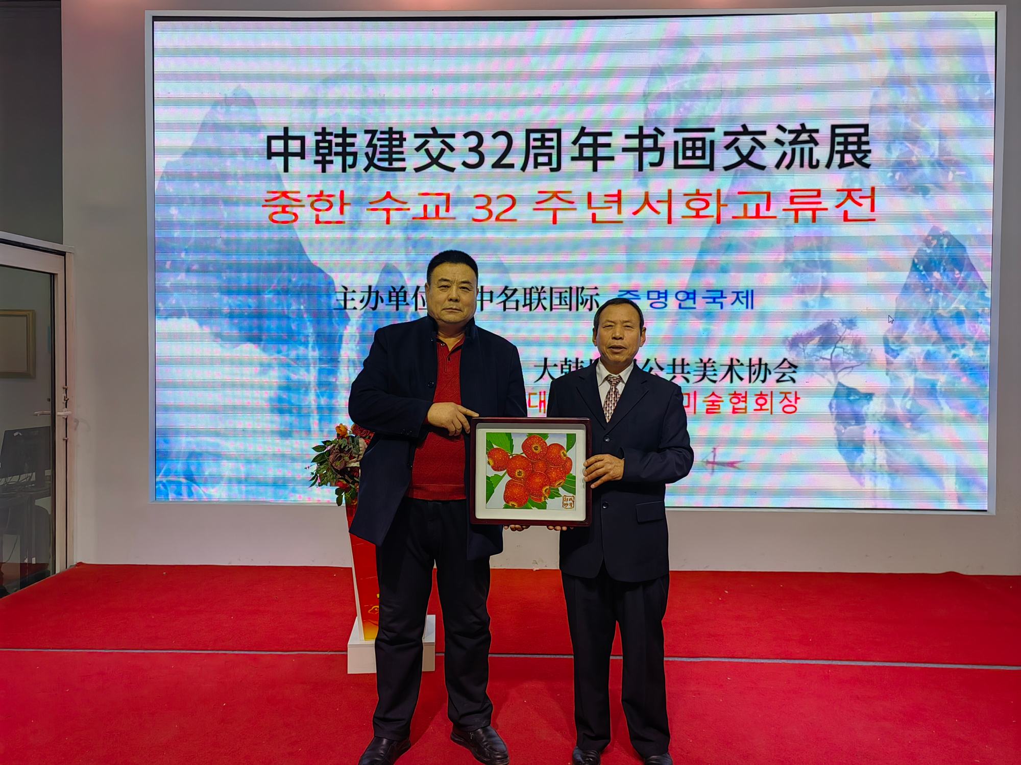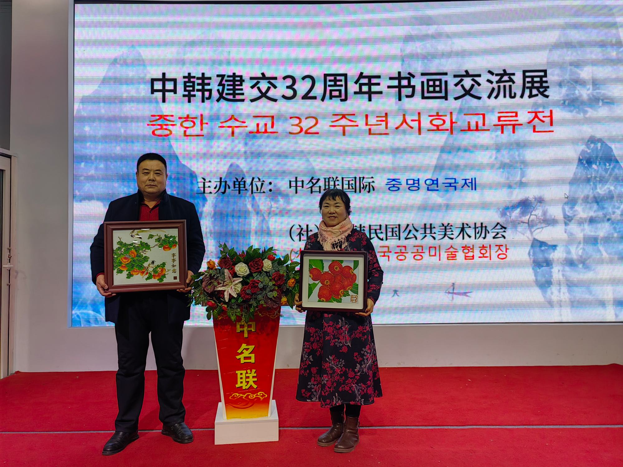 2024年1月28日,中韓建交32周年中韓藝術(shù)交流展在北京中名聯(lián)國(guó)際展廳隆重召開,活動(dòng)由中名聯(lián)國(guó)際和大韓民國(guó)公共美術(shù)協(xié)會(huì)共同主辦,主要目的是加深中韓藝術(shù)家們的友誼和文化交流,加強(qiáng)中韓兩國(guó)人民友誼。鄭氏砂藝第五代非遺傳承人、中名聯(lián)簽約國(guó)禮藝術(shù)家鄭鐵軍先生應(yīng)邀出席了此次活動(dòng),其鄭氏砂藝(畫)被大韓民國(guó)公共美術(shù)協(xié)會(huì)永久收藏,并授予鄭鐵軍“中韓文化交流使者”榮譽(yù)稱號(hào)。同時(shí),韓方表示屆時(shí)將邀請(qǐng)中名聯(lián)簽約國(guó)禮藝術(shù)家赴韓國(guó)國(guó)會(huì)展覽,搭建中韓深化文化藝術(shù)交流橋梁。