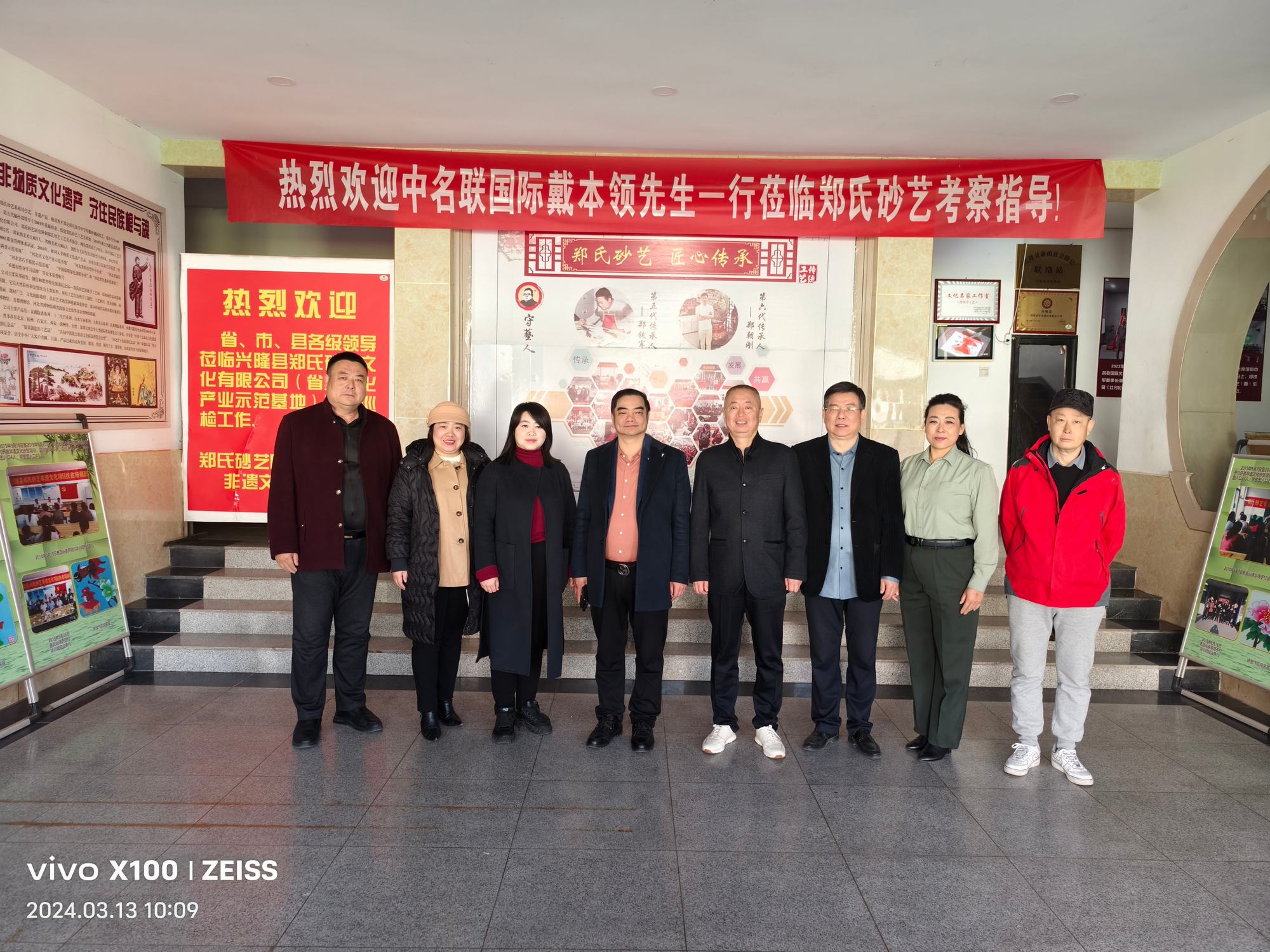 2024年3月12日至13日,中名聯(lián)國(guó)際戴本領(lǐng)總裁一行蒞臨興隆縣鄭氏砂藝文化有限公司,就鄭氏砂藝發(fā)展歷程、發(fā)展模式和發(fā)展規(guī)劃進(jìn)行考察指導(dǎo),一同前來的有原非遺司秘書趙萍,邯鄲市華冶工貿(mào)有限公司黨委書記、董事長(zhǎng)、北京華納中創(chuàng)文化發(fā)展有限公司執(zhí)行董事張書明,中國(guó)國(guó)務(wù)外事國(guó)賓禮特供藝術(shù)家、中國(guó)女畫家協(xié)會(huì)會(huì)員時(shí)愛華。興隆縣人大常委會(huì)黨組副書記、副主任高春青,興隆縣委宣傳部副部長(zhǎng)、文明辦主任溫偉,清華大學(xué)文化與旅游產(chǎn)品設(shè)計(jì)研發(fā)中心原總監(jiān)尹建民教授,鄭氏砂藝董事長(zhǎng)鄭鐵軍等陪同參觀。