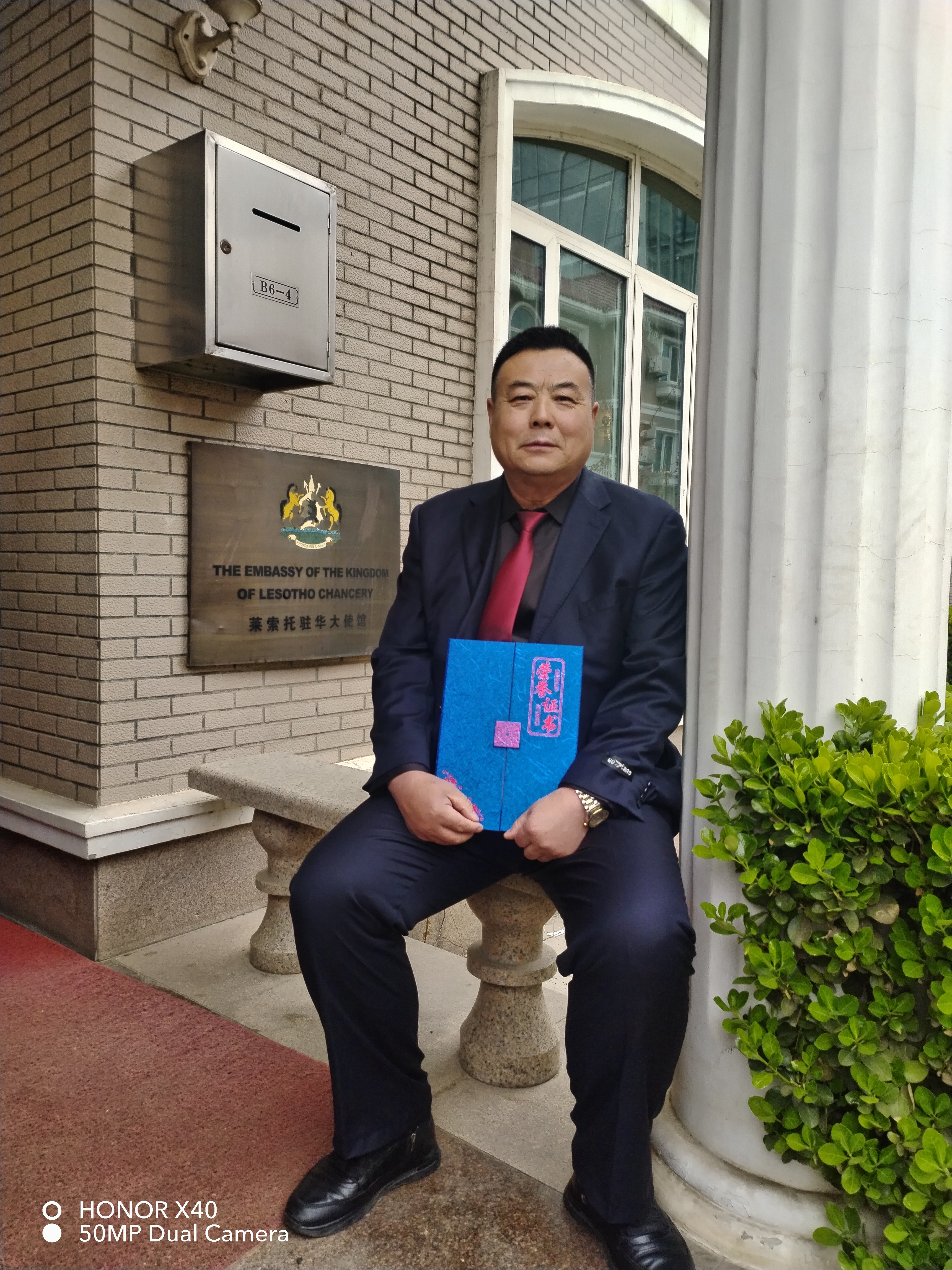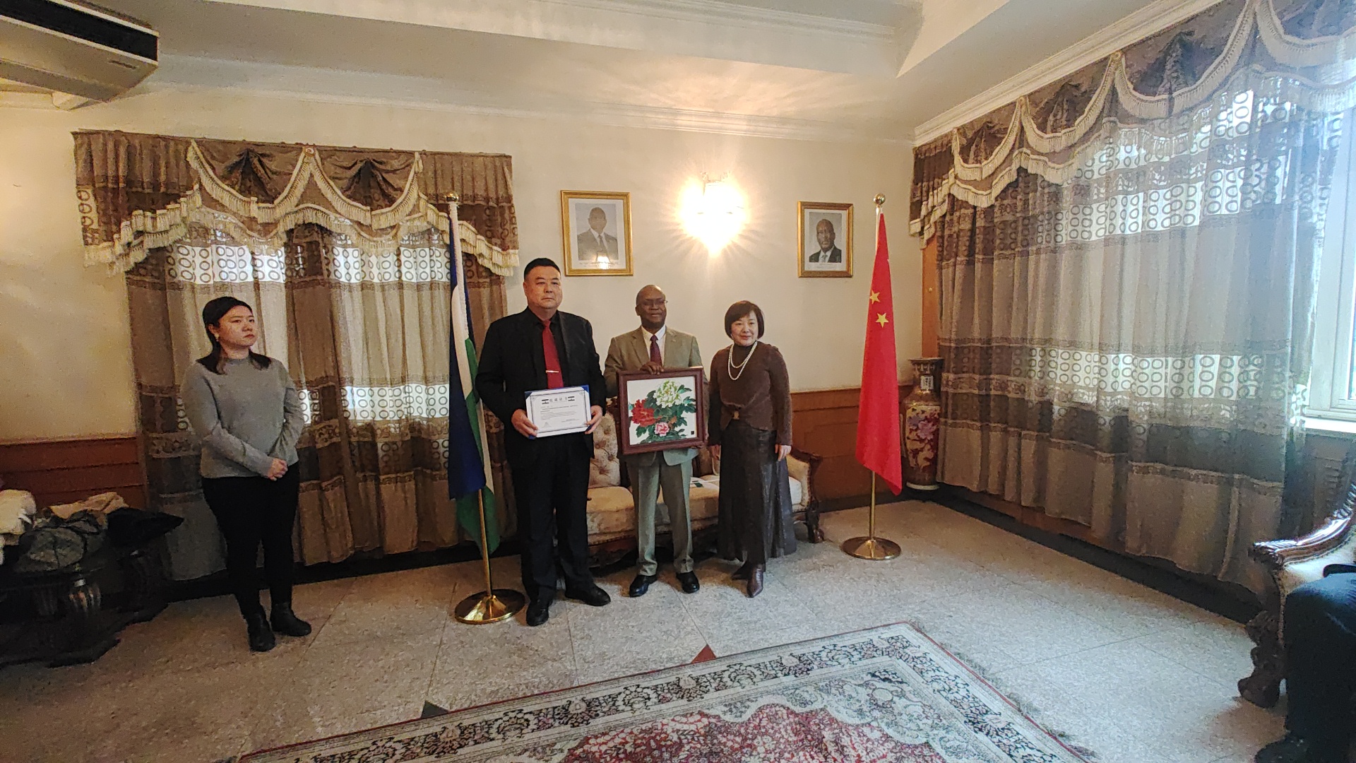 萊索托王國駐華大使邀請中名聯(lián)國際趙萍女士推薦的中名聯(lián)簽約國禮藝術(shù)家鄭鐵軍,于2024年3月26日至27日上午前往萊索托王國駐華大使館進行中萊文化交流。萊索托駐華外交官杜麥羅.莫塞邁公使銜參贊對趙萍女士和鄭鐵軍先生的到來表示熱烈歡迎。在萊索托王國駐華使館會客廳中,鄭鐵軍向杜麥羅.莫塞邁介紹了鄭氏砂藝(畫)藝術(shù)特點和文化內(nèi)涵,萊索托王國外交官對鄭鐵軍的作品給予高度評價,對傳統(tǒng)文化藝術(shù)鄭氏砂藝(畫)所蘊含的深厚中華文化底蘊極其贊賞,現(xiàn)場將鄭鐵軍的作品《國色天香》作為國禮永久收藏。杜麥羅.莫塞邁公使銜參贊表示非常榮幸,愿意將更多的鄭氏砂藝(畫)作品贈送全球友華政要,成為中國文化國際傳播橋梁,隨后,親筆簽名收藏證書,并授予鄭鐵軍中非文化交流使者榮譽稱號。